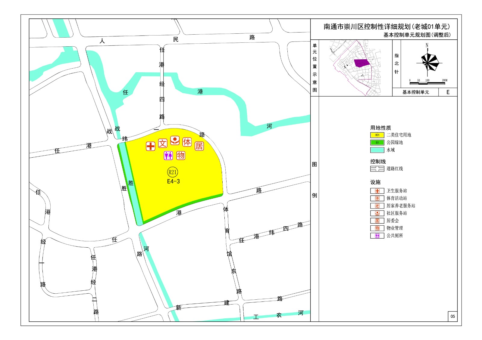 4、拟将任港路北、战胜路东居住用地(E4-3)及居住服务设施用地(E4-4)调整为居住用地,配套设施在地块内解决,拟调整后地块指标为:容积率≤2.3,建筑密度≤20%,绿地率≥35%,建筑高度≤80米。